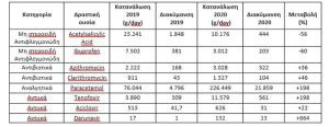 Πίνακας 1. Σύγκριση της κατανάλωσης δραστικών ουσιών αντιπροσωπευτικών φαρμακευτικών κλάσεων για το 2019-2020.